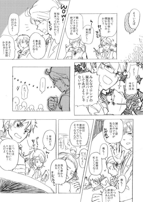 ロシアさんの誕生日が年末だと知ったアメリカはみんなでパーティーしてあげようじゃないか!と提案するが(単に自分が騒ぎたいだけ)