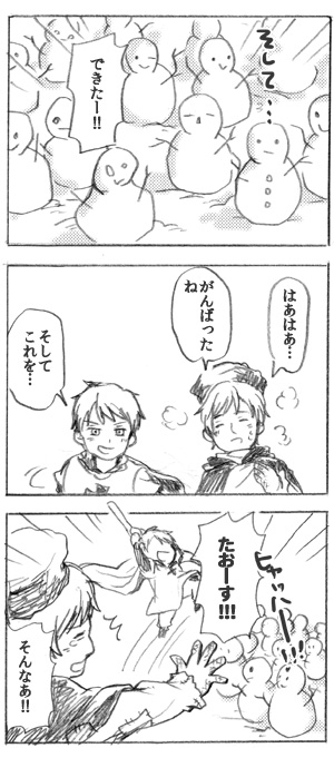 雪だるま(露・普) ロシアさんとプロイセンのわかりあえなさについて でもけっこう好き好んで絡みにいってるぽいところがかわいいとおもいます!!! 雪が降った時ヒャッハーー!!!てなって描いたけどもう春だよ!!!!? |2013/03/21|