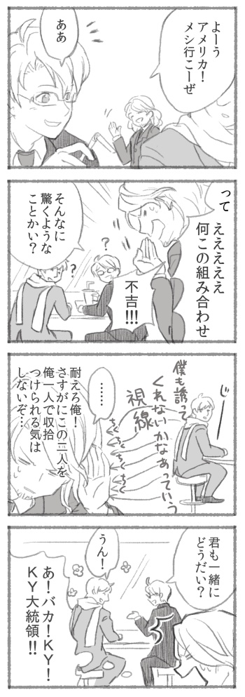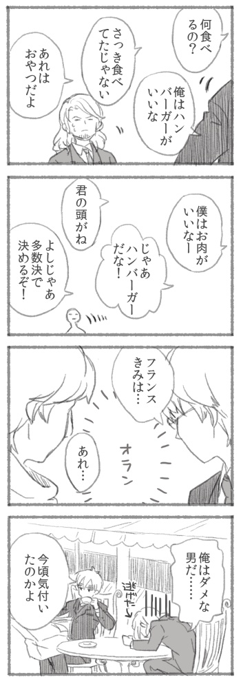 なさけない男(露・米・仏) ロシアさんとアメリカが仲良さげなのをみてビックリした兄ちゃんの話(37話)で思いついたもの 一人ならなんとかなりそうな感じだけど、二人揃うともうダメっていうイメージ |2016/02/08|