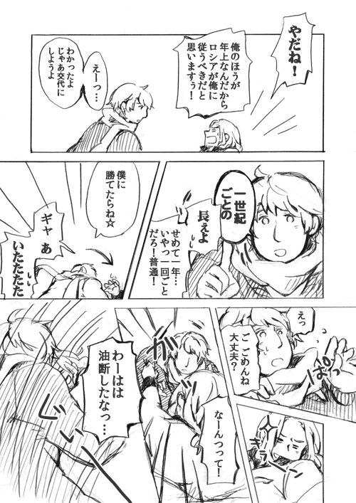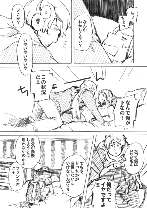 兄ちゃんとロシアさんだとお互いタチがいい!!って言い張って両者一歩も譲らないことになりそうで、そんなことになったら必然的に力技で露仏の流れになるのだけど、なあなあで流されたら今後一切タチれなさそうな雰囲気を感じ取った兄ちゃんがどうにか仏露にもっていこうとする話。